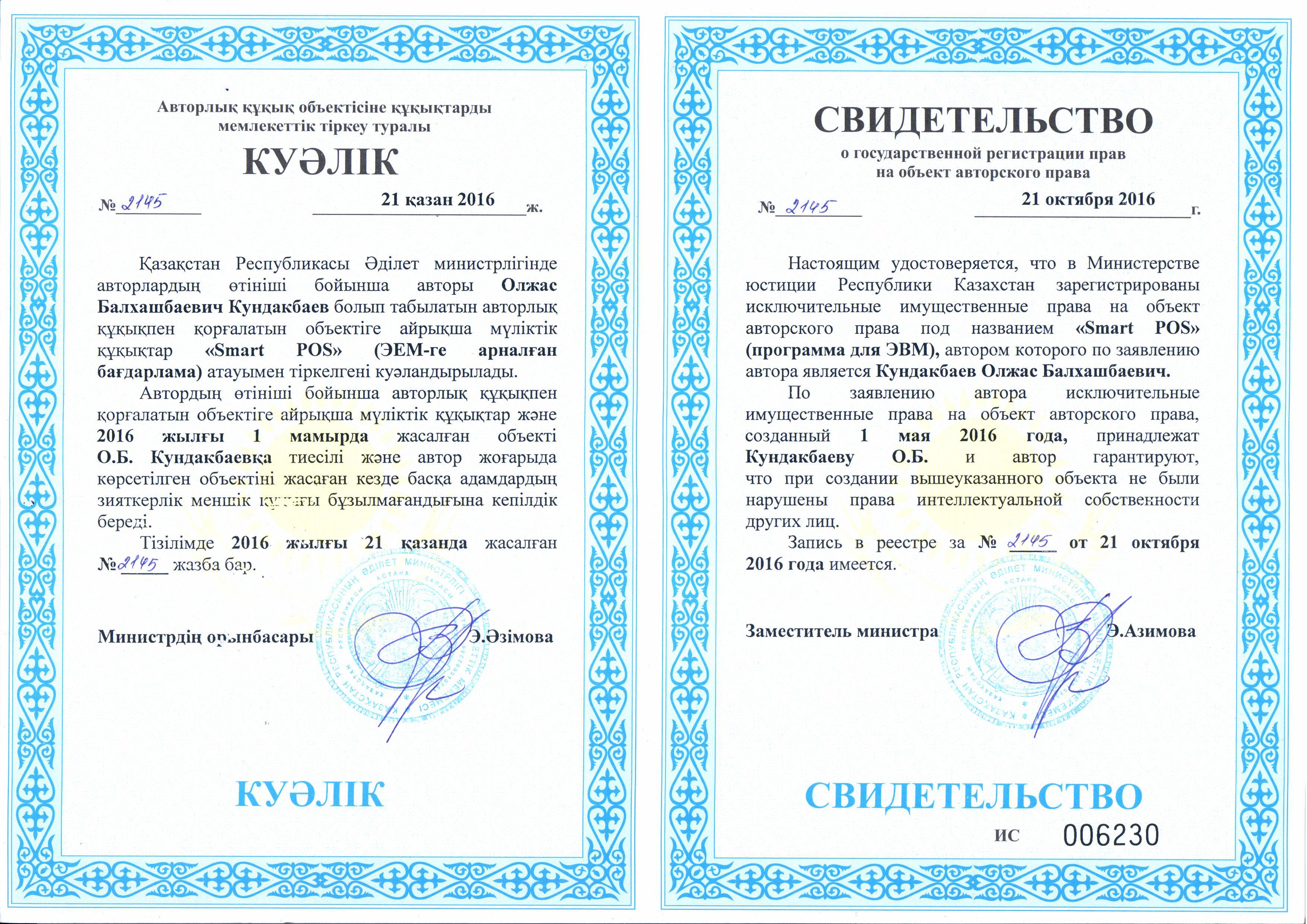 | Правообладатель ПО | Кундакбаев Олжас Балхашбаевич |
