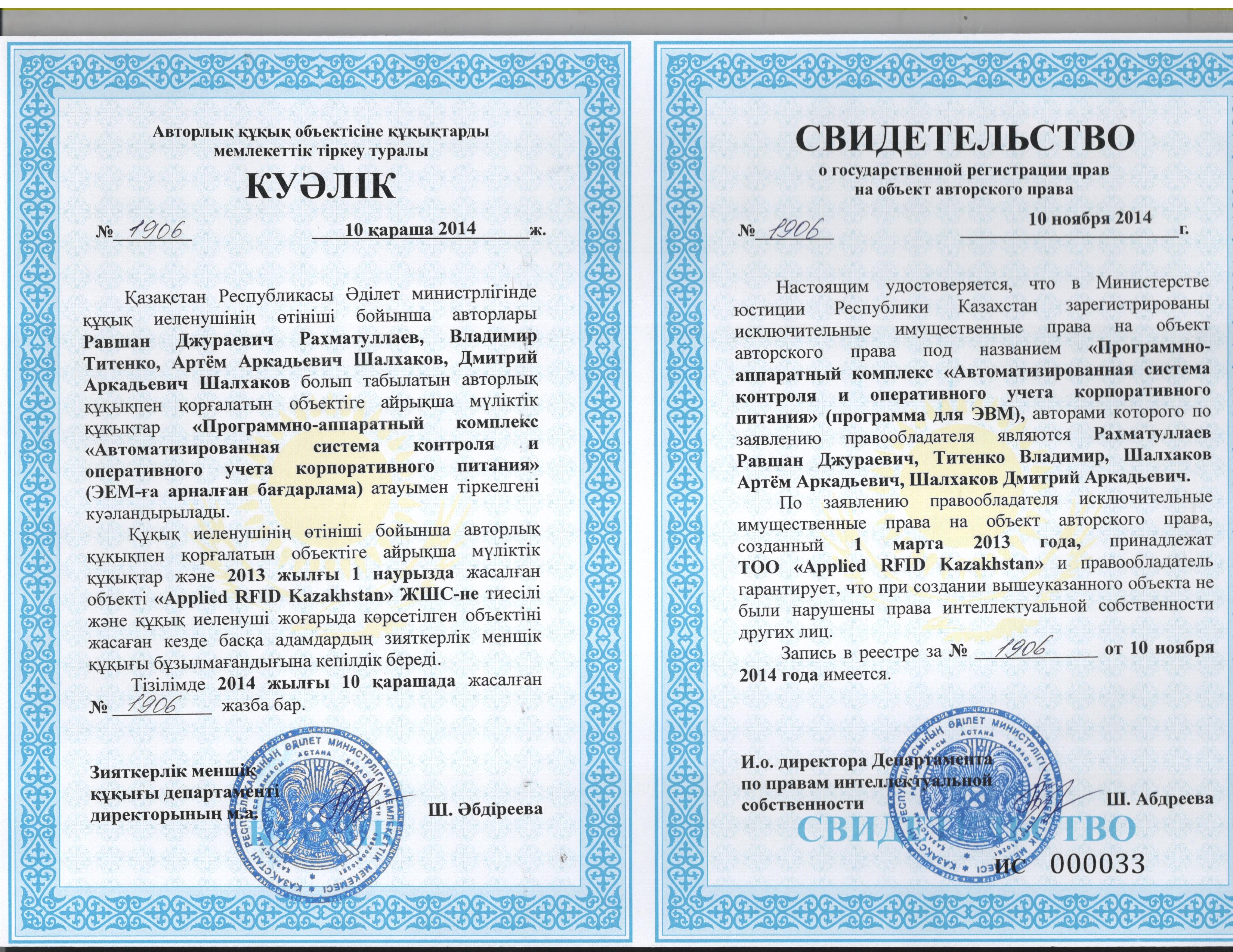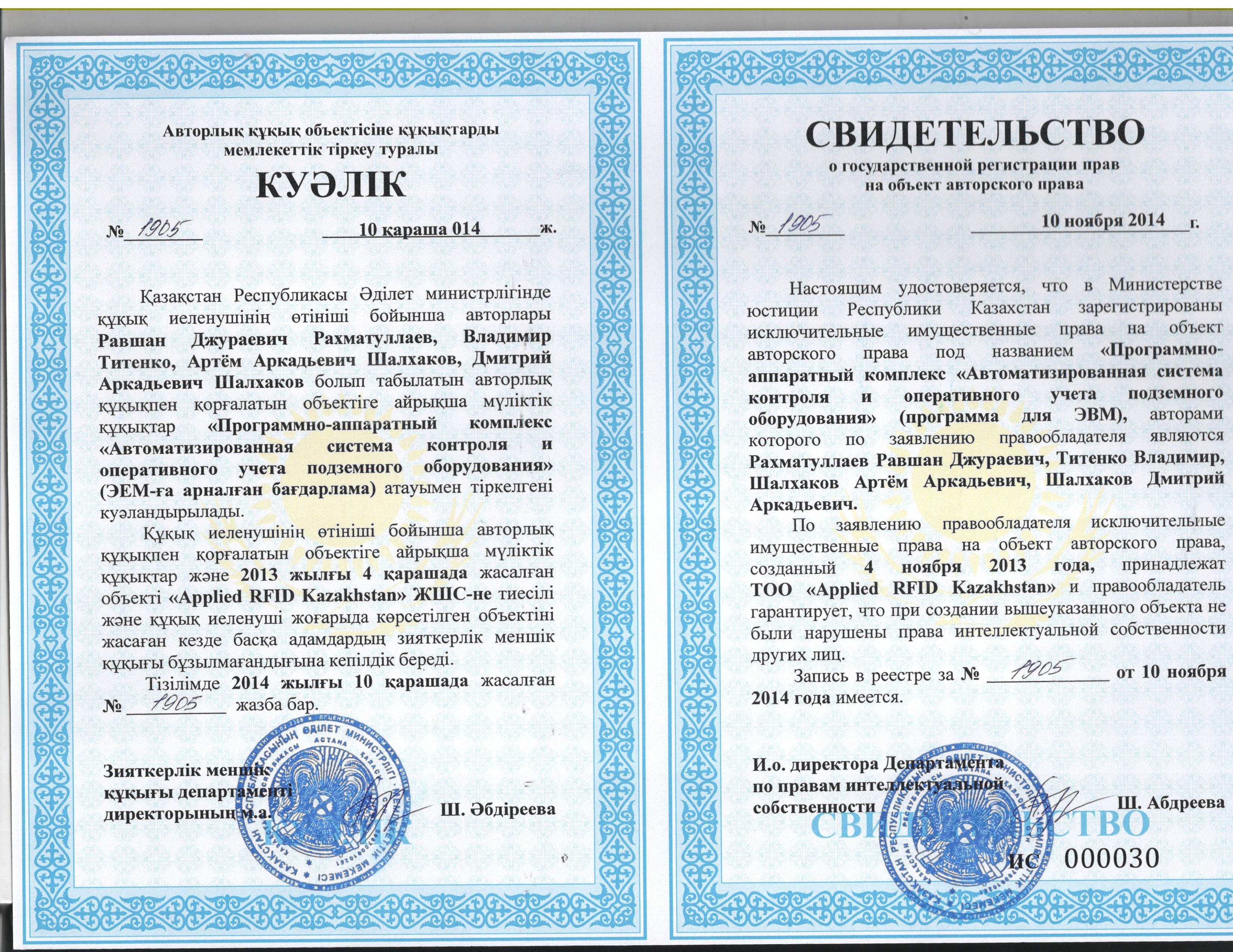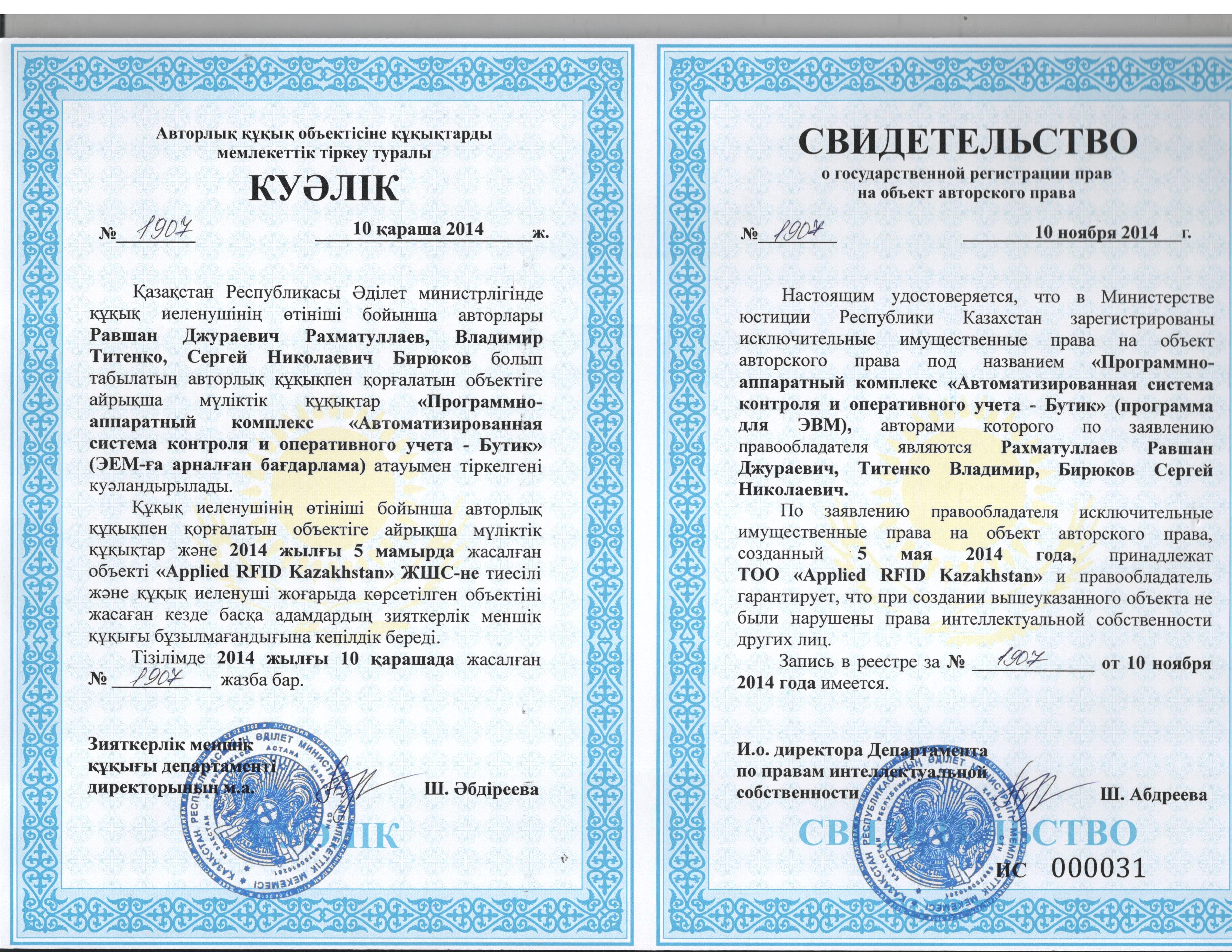 | Правообладатель ПО | ТОО "Applied RFID Kazakhstan" |